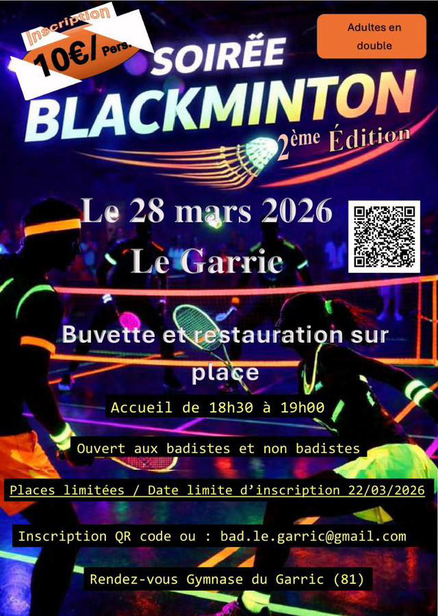 Blackminton 2026 Date/heure Date(s) - 28/03/202618h30 - 23h00 Emplacement Gymnase Le Garric Catégories Sport